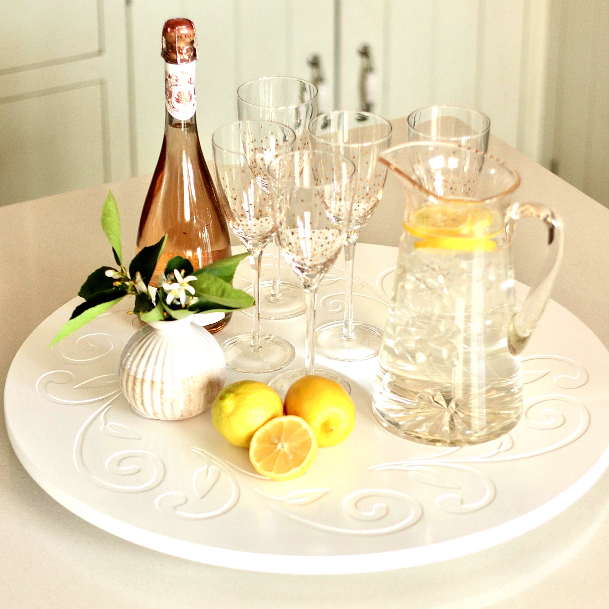 Elevate your table service with this custom engraved Lazy Susan, crafted from quality wood and finished in crisp white. Perfect for entertaining, it combines functionality with personalized elegance—ideal for displaying appetizers, condiments, or decorative pieces. The smooth rotating base ensures effortless access from all angles, while the custom engraving adds a distinctive touch that makes it a memorable gift or a refined addition to your own home.