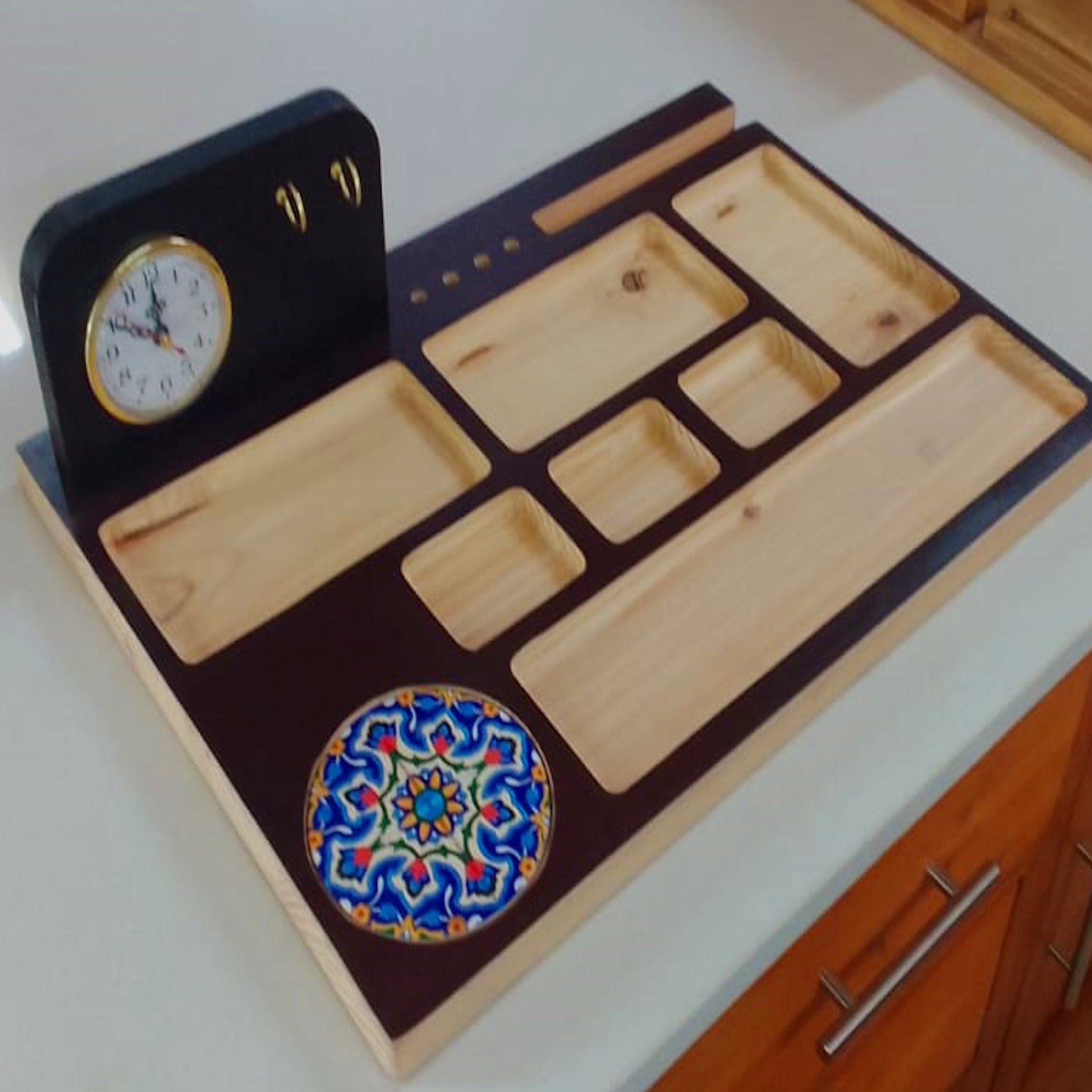 The Two Toner desk organiser combines compact design with craftsmanship, perfect for small spaces or minimalist setups. Its sturdy two-tone wood construction adds elegant contrast while providing durable storage. Integrated into the design is a sophisticated clock, blending practicality with style to keep your workspace organized and timely. Ideal for professionals seeking both efficiency and refined aesthetics in a limited area. And a beautiful place for you coffee or any beverage.