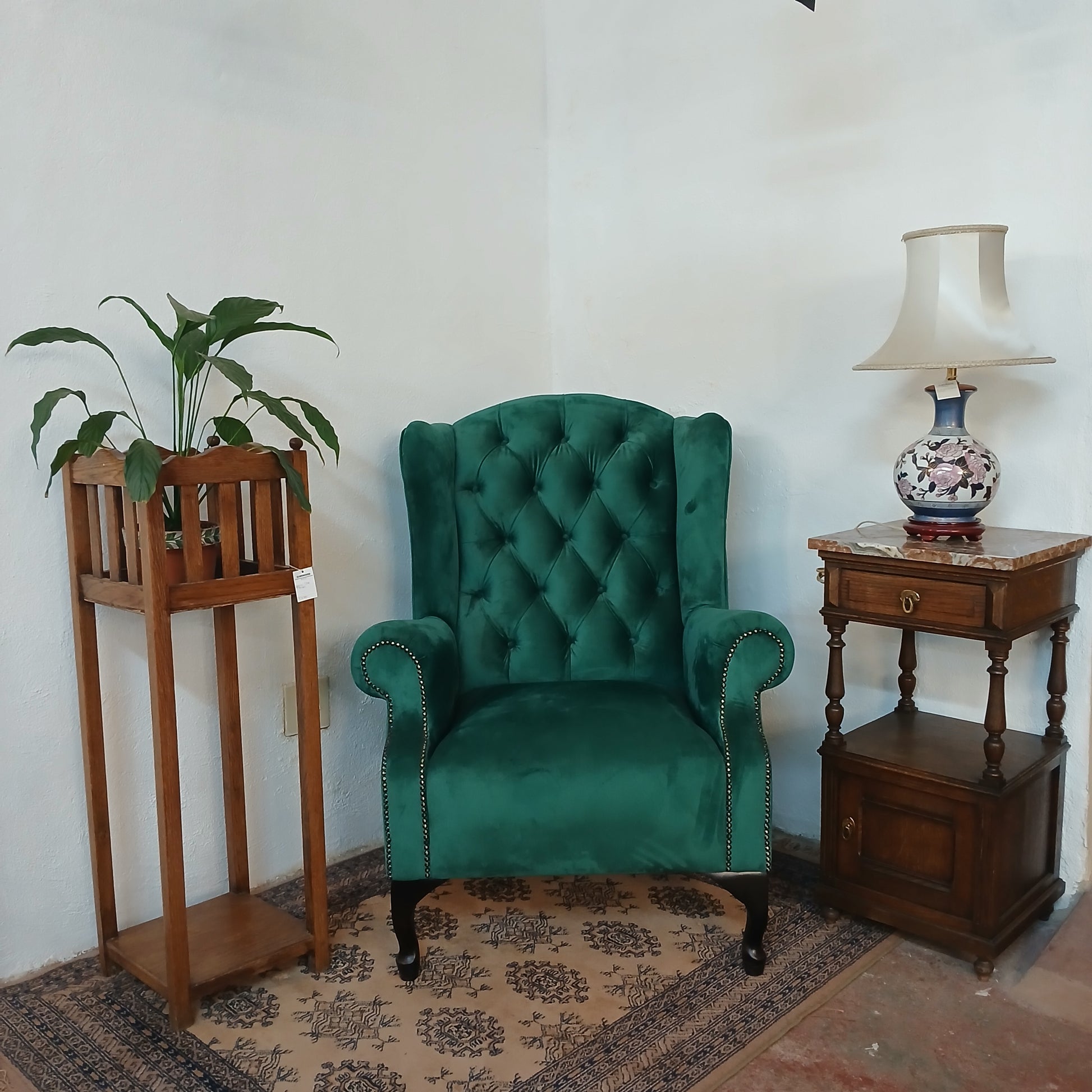 Wingback chair, pedestal & flower pot